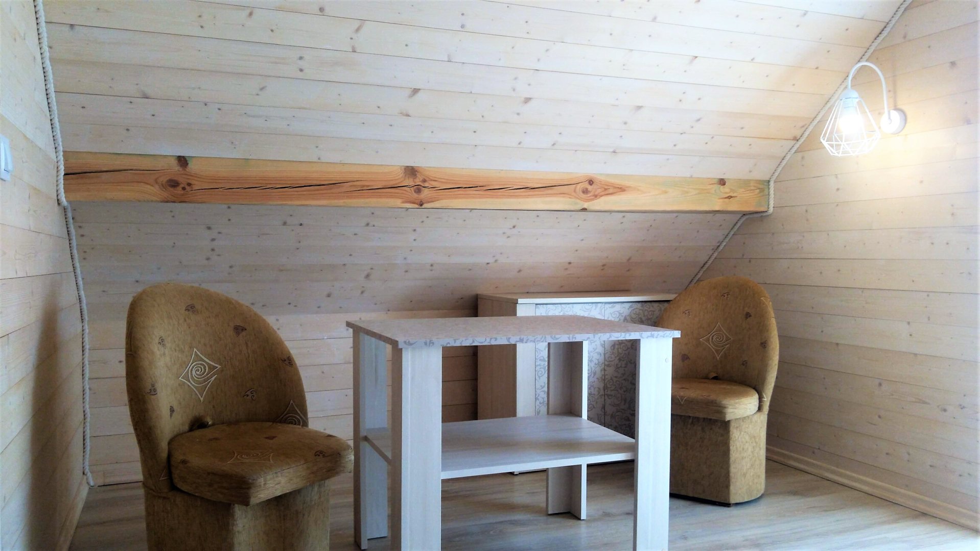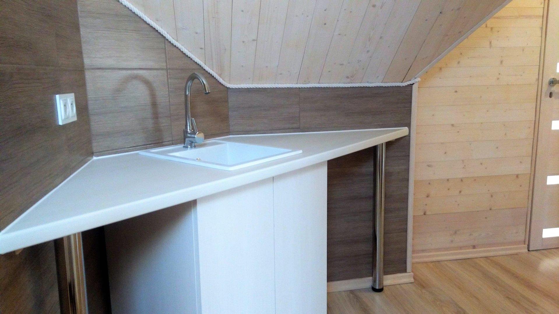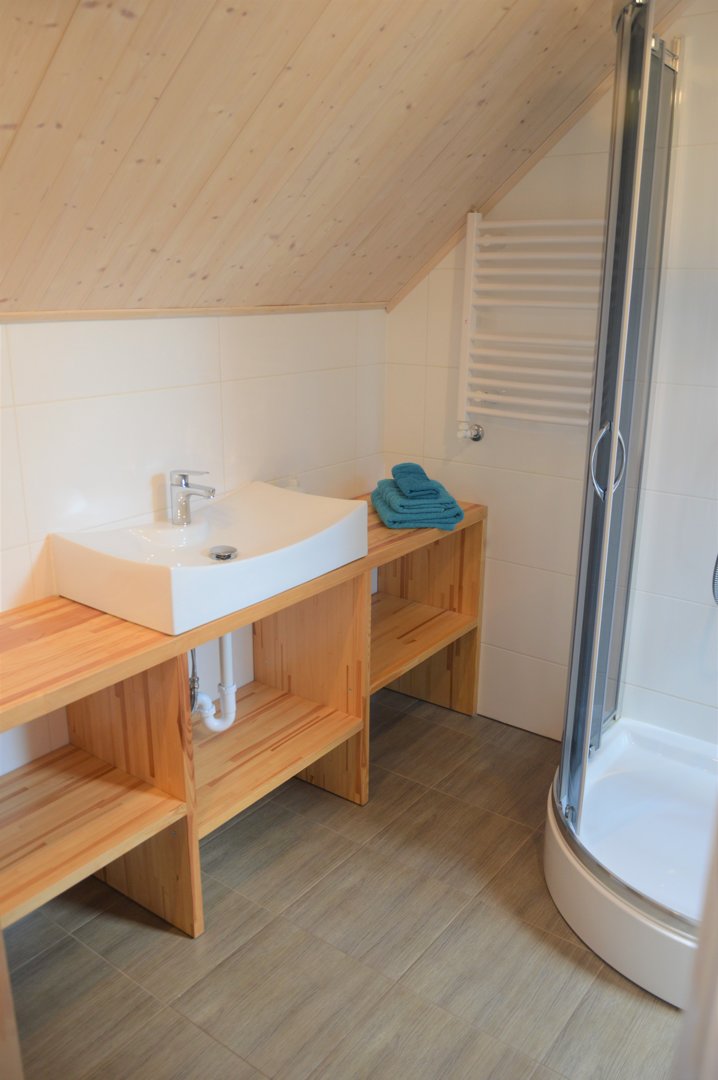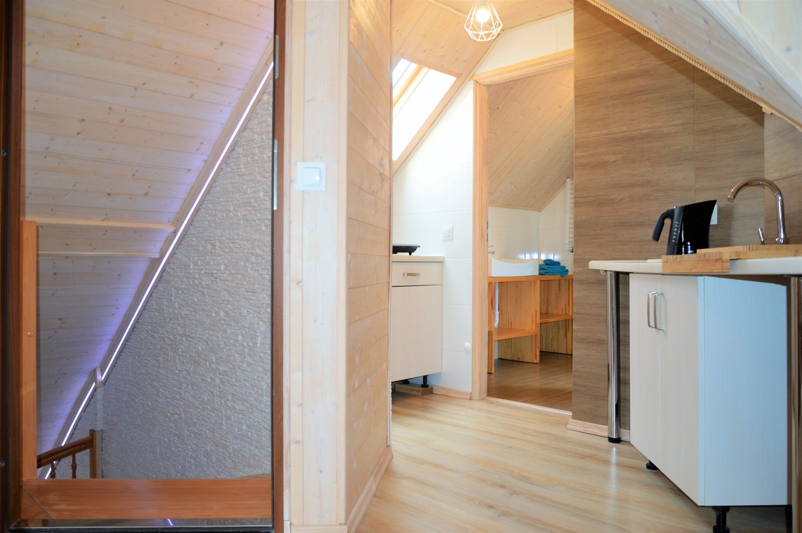 Skośne ściany, wyłożone naturalnym świerkiem skandynawskim, nadają niesamowity charakter wszystkim pomieszczeniom.